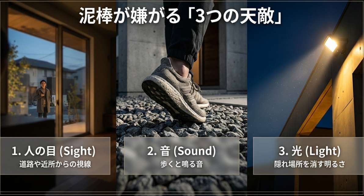 泥棒が嫌がるのは、大きく分けて次の3つです。