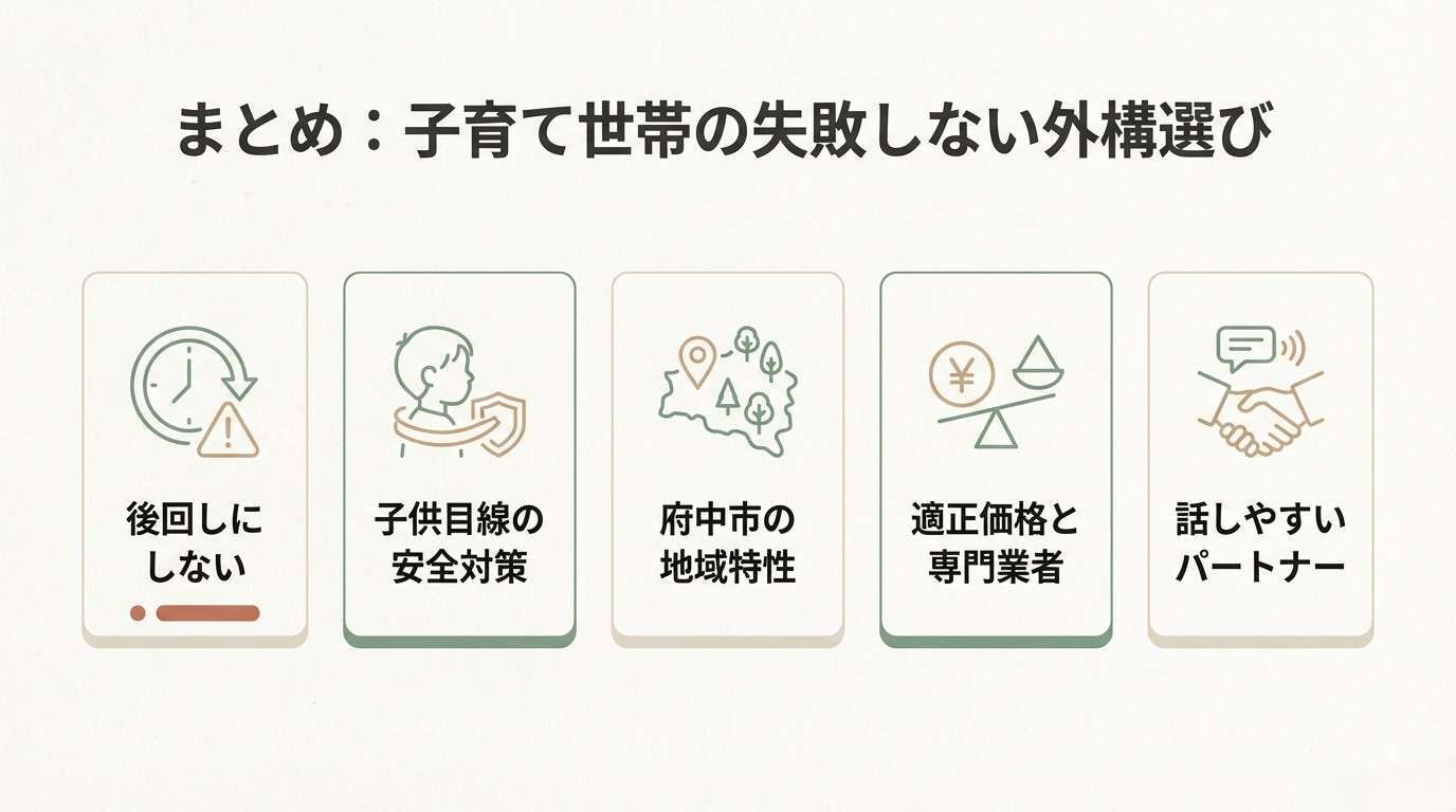 ここでは、府中市周辺で新築をご検討中のパパ・ママに向けて、外構工事で失敗しないための「最初に確認したい5つのポイント」をわかりやすくお話ししますね。