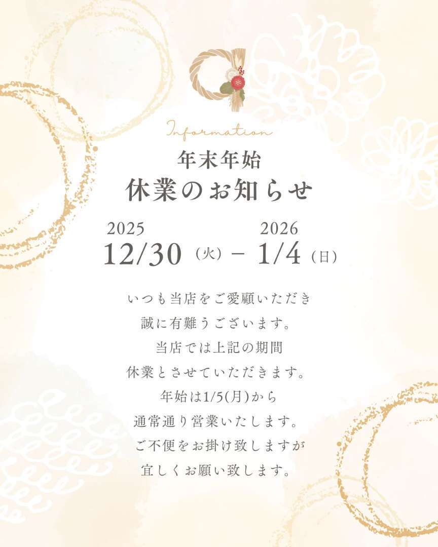 なお、休業期間中にいただいたお問い合わせやご注文につきましては、2026年1月5日(月)より順次対応させていただきますので、何卒ご了承くださいませ。