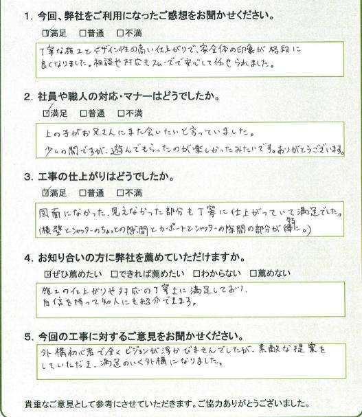 弊社が施工をしたお客様からお客様の声を頂きましたので、ご紹介します。
